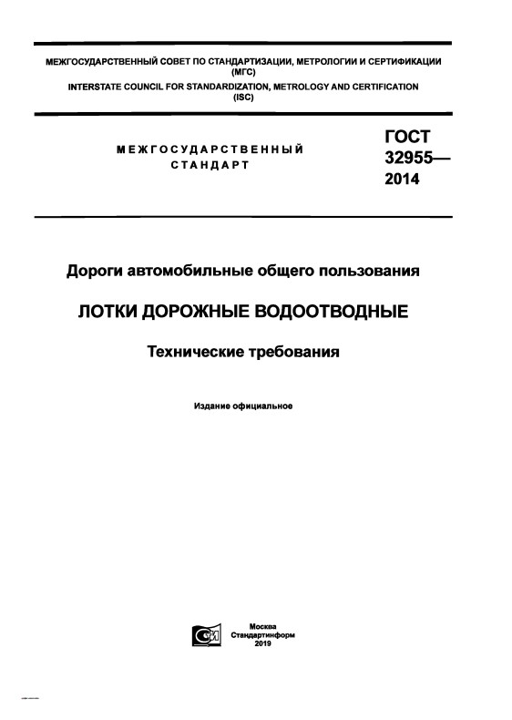 Главная / ГОСТ 32955-2014 Дороги автомобильные общего пользования. Лотки дорожные водоотводные. Технические требования