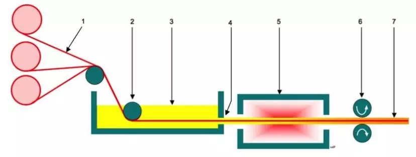 1 — стекломатериалы (ровинг, ткань); 2 — пропиточный ролик; 3 — ванна со связующим; 4 — ровинг, пропитанный связующим; 5 — формообразующая фильера; 6 — тянущее устройство; 7— готовое изделие.