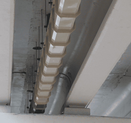Такой подход позволяет полностью применять унифицированные металлические крепежные изделия с заводским антикоррозионным покрытием. Для крепления лотков к подвескам в качестве альтернативы металлу успешно применяется стеклопластиковый конструкционный профиль в виде уголка, изготовленный промышленным методом пултрузии. Поперечные кронштейны из уголка легко могут быть изготовлены подрядной организацией прямо на объекте, т.к. стеклопластик не требует какой-либо окраски или обработки, при этом очень легко режется и сверлится. Данная конструкция крепления лотков позволяет регулировать их уклон в том случае, когда он не обеспечен продольным профилем сооружения.