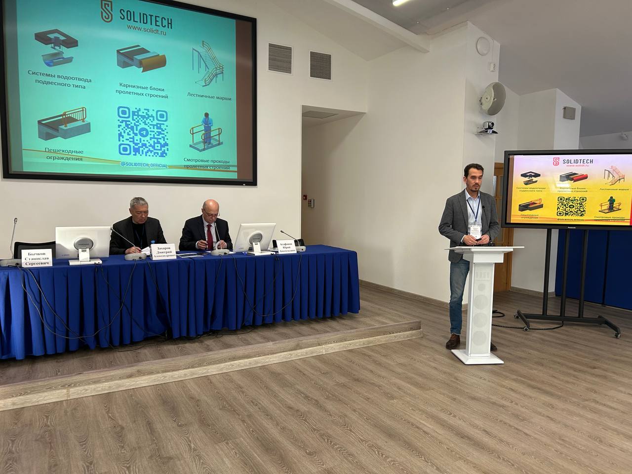 В рамках мероприятия генеральный директор ООО «Солидтех» Даниил Мащетов выступил с докладом об опыте применения карнизных блоков из композиционных материалов на объекте "1 этап строительства ШМСД. (Витебская развязка ЗСД)".
